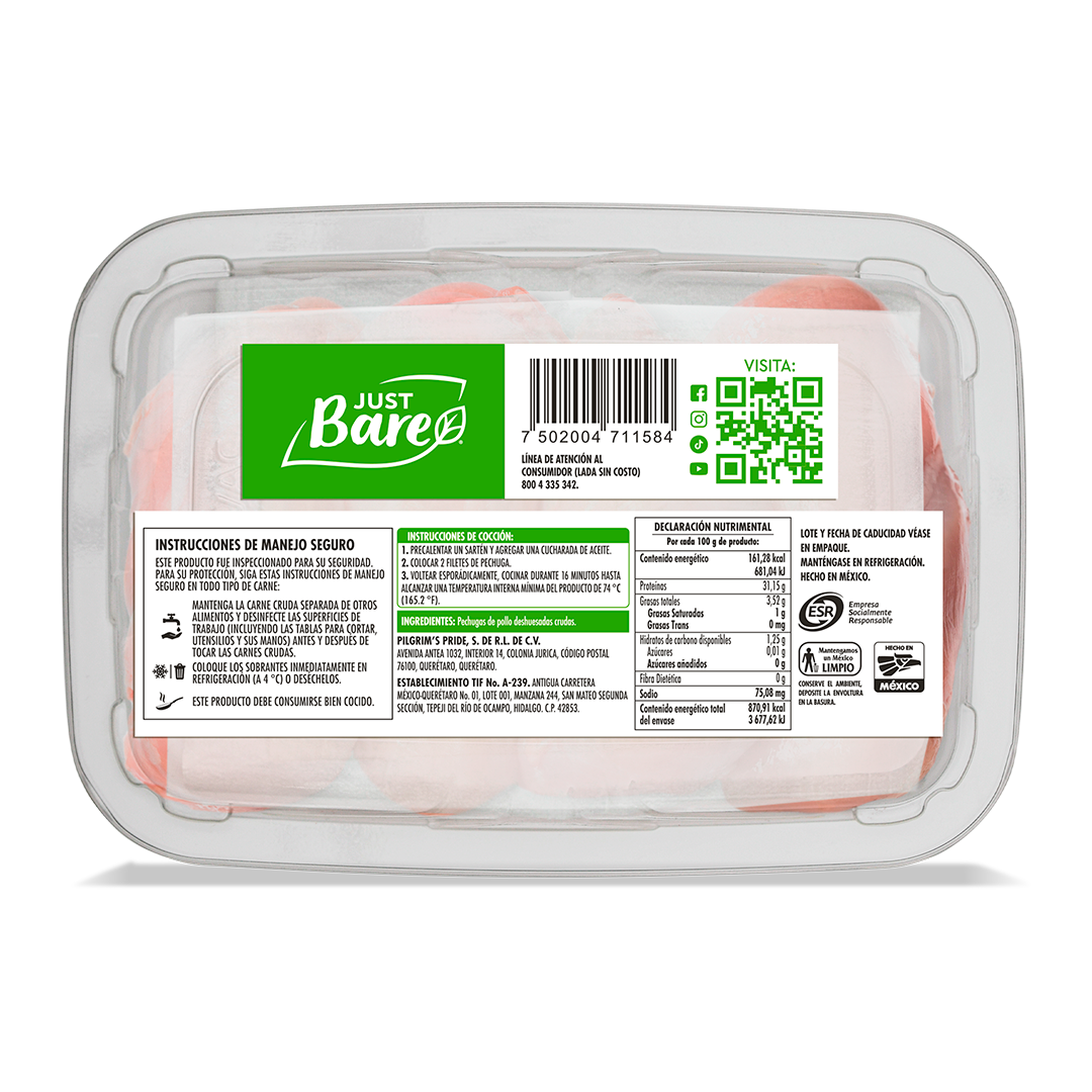 Pechuga sin hueso y sin piel, blanca, aplanada, fresca.