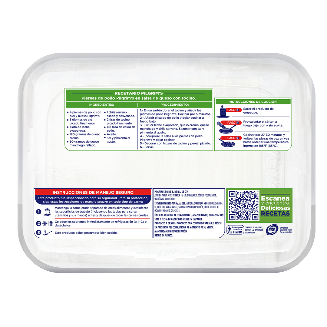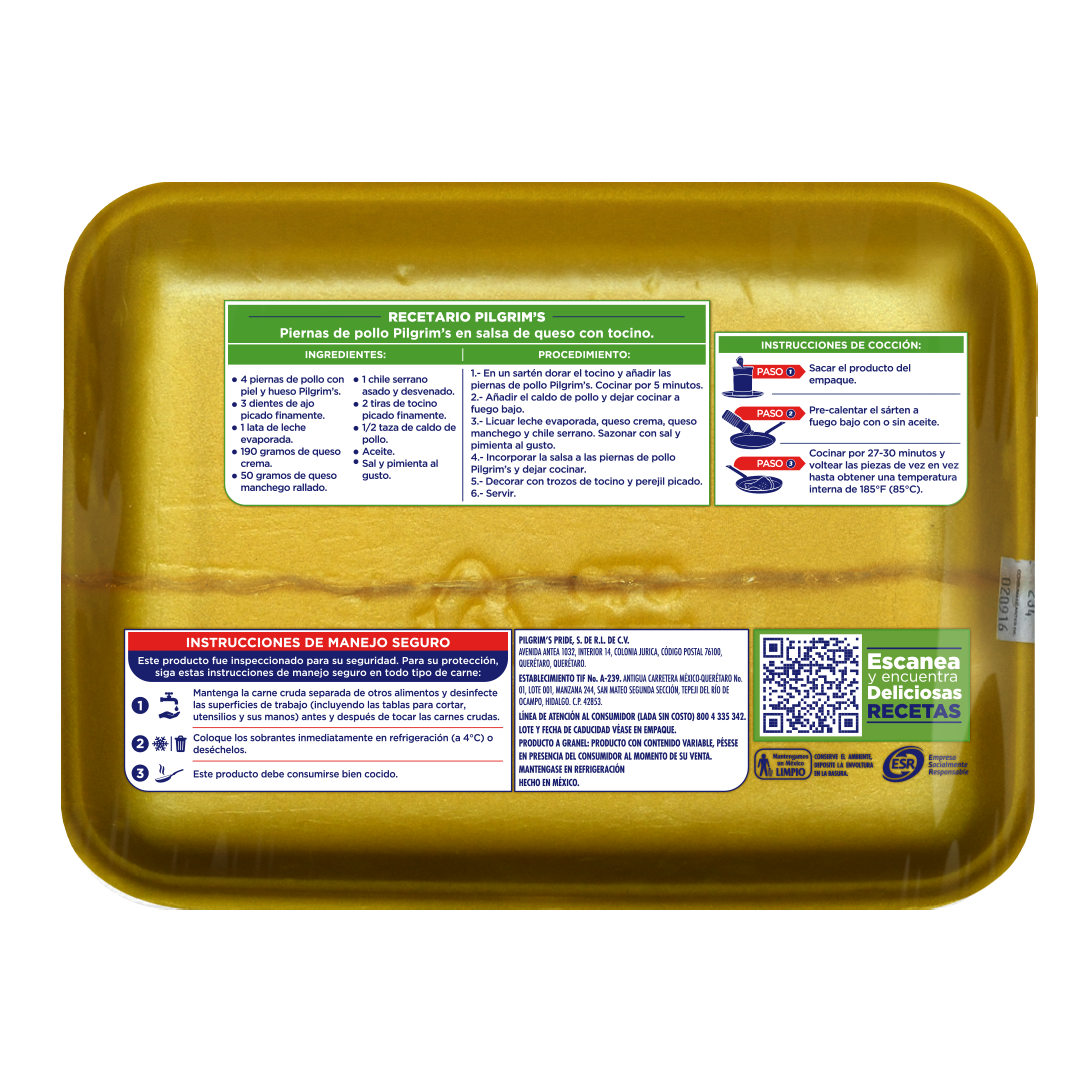 Sugerencias de preparación: En sartén por 30 minutos o hasta alcanzar temperatura mínima de 85°C (185 °F)